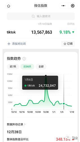 他们变现也简单,就直接发视频时候挂商品,一单49块,卖了两三百份,妥妥的一万多到账!对于我们做互联网的人来说,这个操作很简单,不是什么难事,但不懂操作的人依然有那么一大堆,毕竟这个操作就有门槛壁垒。我经常说,就算一个很赚钱很赚钱的信息全网曝光,全国依然有上亿人不知道!很多人想了解玩一下tiktok,但是没有方法,这就是需求,查了下微信指数,最高时候破亿,平时大几千万的搜索关注指数,从侧面体现出关注tiktok的人不少