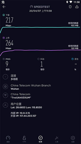 4、全网测速:支持Wi-Fi、各大运营商与2G/3G/4G/5G测速