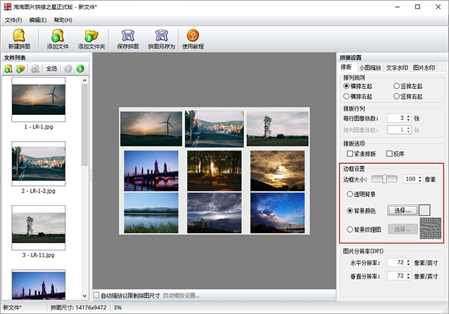 当文件添加好之后,请查看窗口右侧的“拼接设置”面板,在该面板中,您可以设置所有的图片拼接参数,每更改一项设置,窗口中部的拼接预览图会实时更新显示,如下图所示: