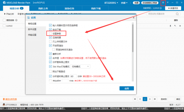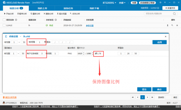 如果没有勾选“设置参数”的话会默认依据C4D文件的渲染设置渲染,分析后自动上传提交,如果勾了的话就可以自定义帧数范围和图像比例。