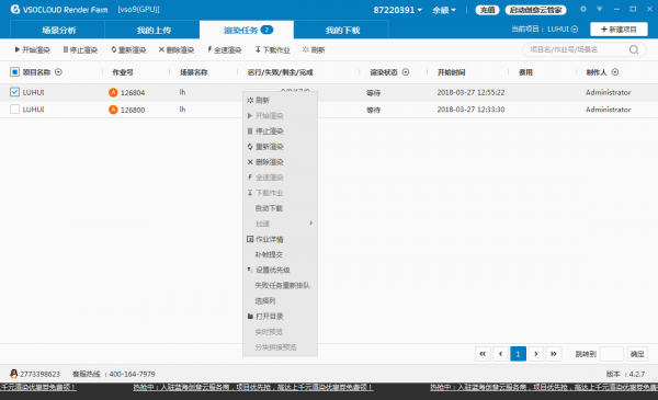 下载渲染完成的作业,橙色圈“A”表示自动下载,可直接右键——“打开目录”找到已经渲染完成的作业。没有自动下载的作业可右键该作业选择“下载作业”。
