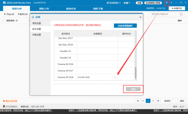 点击设置——版本设置——文件夹,选择C4D安装根目录,读取到路径后,点击“应用”。