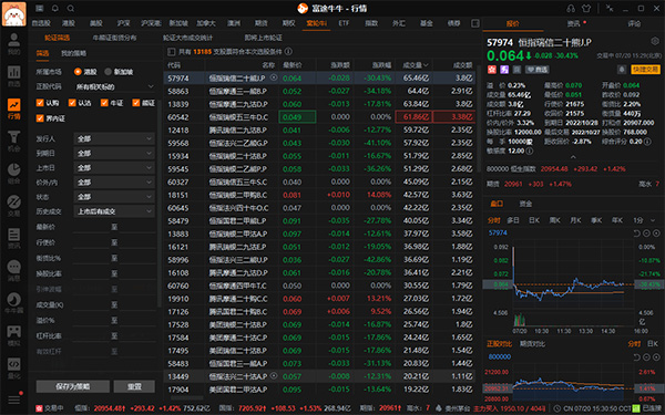 用户可在【选股】tab进入窝轮栏目,选中某只窝轮,可直接在右侧栏看到对应走势图,和正股的走势图,同时对比,更简单直观。
