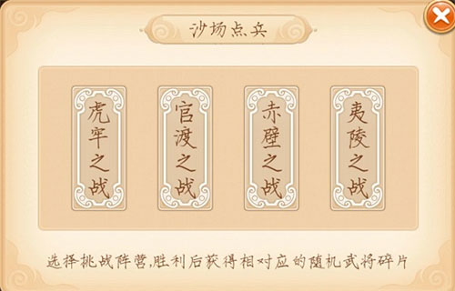 沙场点兵中的官渡之战得到的文武宝箱中可以选两片夏侯碎片(前期推荐打官渡之战至少两个有用的碎片);