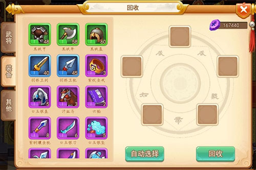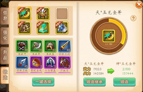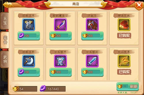 也是每天限制免费刷新15次,有锻造铁、草、书,可以将装备的属性提升,从紫色到金色分别需要20,40,80,120,160,200的材料。(建议前期先提升武器[优先发育输出部分],增加1的来源)对了,忘记写装备原石的来历,通过金币在商店买的绿、蓝装备再回收得到。
