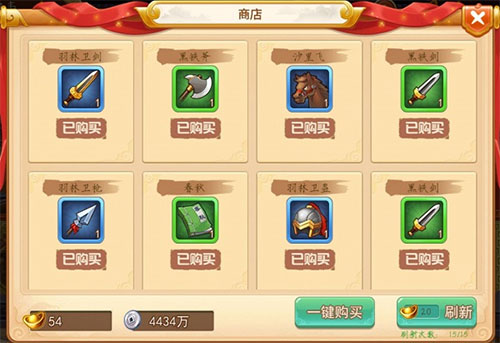 2、星典韦配合荀攸打出一点伤害,前期炮弩计不够用 梅花标(180%武力伤害) 代替,之后到商店买材料装备,
