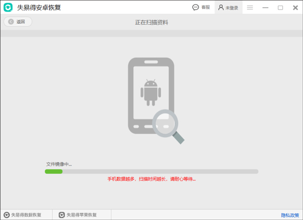 3、当软件扫描时,扫描的时候会先镜像手机,再进入数据扫描,在这一阶段只要保持扫描不被中断即可,