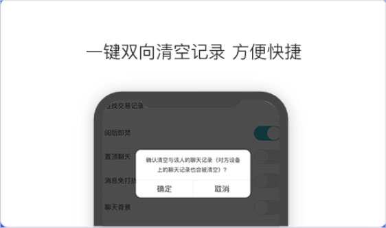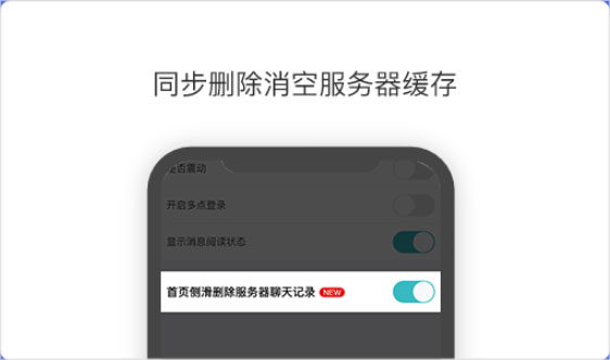 传统的清除缓存都是删除手机上的缓存,当你恢复聊天记录的时候内存又占满手机,勾选此功能后每次删除聊天记录都会发送指令给服务器,进行数据删除处理,删除后服务器就不存在这些信息,不可恢复。