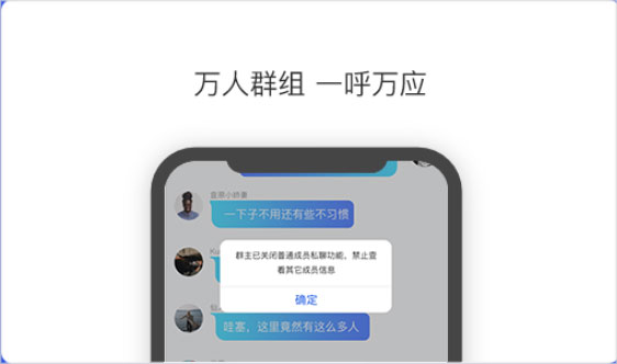 万人群组最大容量达到10000(万人)同时在线沟通,无论是商业群组还是娱乐群组,让你们的互动更丰富多彩,简单高效,一呼万应。