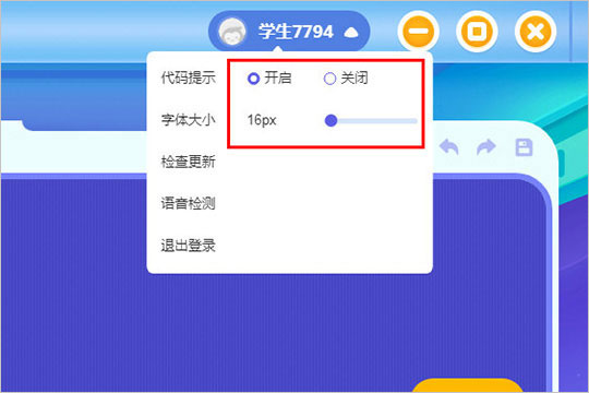 7、如果你想要调节字体或关闭代码提示,还可以点击右上角的“用户名”进行设置调节;